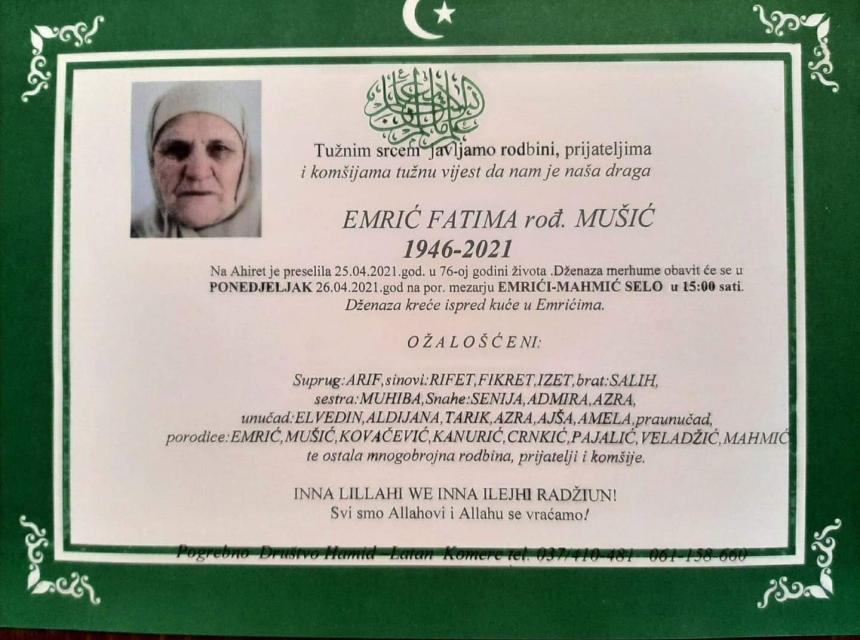 Tužnog srca i s bolom u duši obavještavamo rodbinu, komšije i prijatelje da je naša draga Emrić Fatima rođ. Mušić, dana 25.04.2021 godine, u 76-oj godini života, preselila na Ahiret.