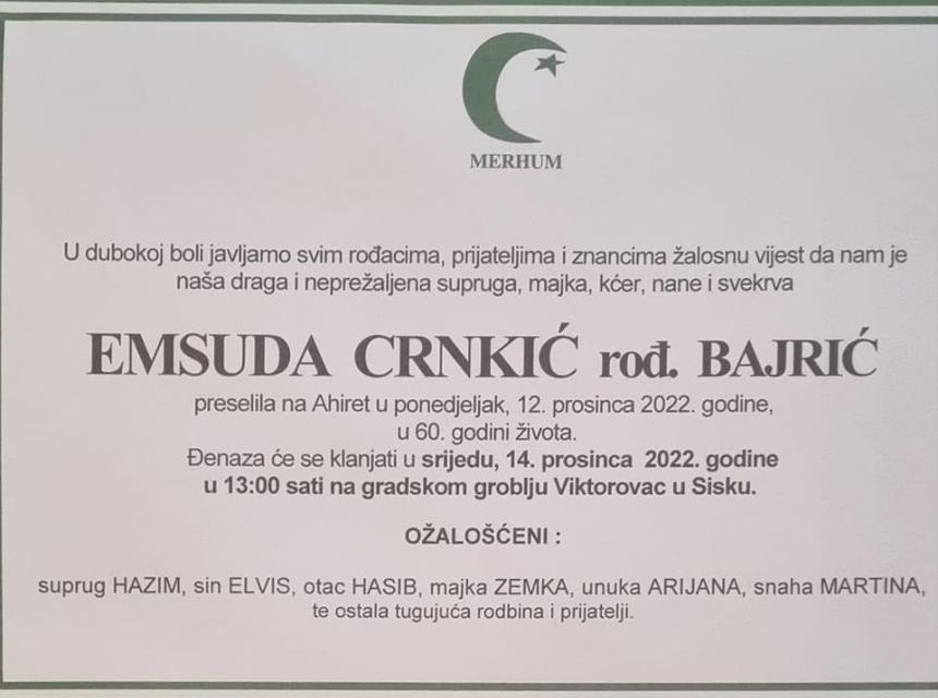 Tužnog srca i s bolom u duši obavještavamo rodbinu, komšije i prijatelje da je naša draga Emsuda Crnkić rođ. Bajrić u 60. godini života preselila na Ahiret.