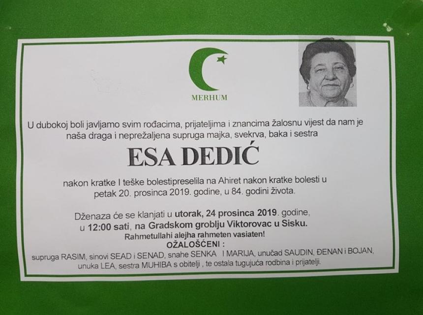 Tužnim srcem i s bolom u duši javljamo rodbini, prijateljima i komšijama da je 20.12.2019. godine, nakon kratke bolesti, u 84. godini života na Ahiret preselila Esa Dedić.