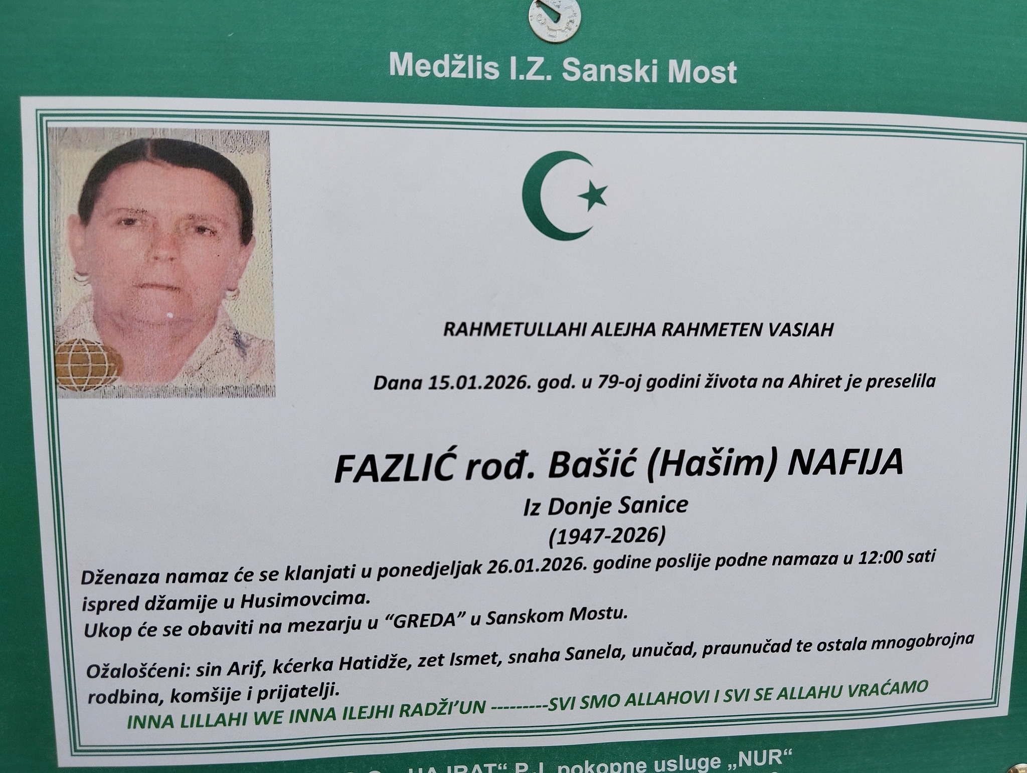 Dana 15.01.2026. god. u 79-oj godini života na Ahiret je preselila FAZLIĆ rođ. Bašić (Hašim) NAFIJA iz Donje Sanice.