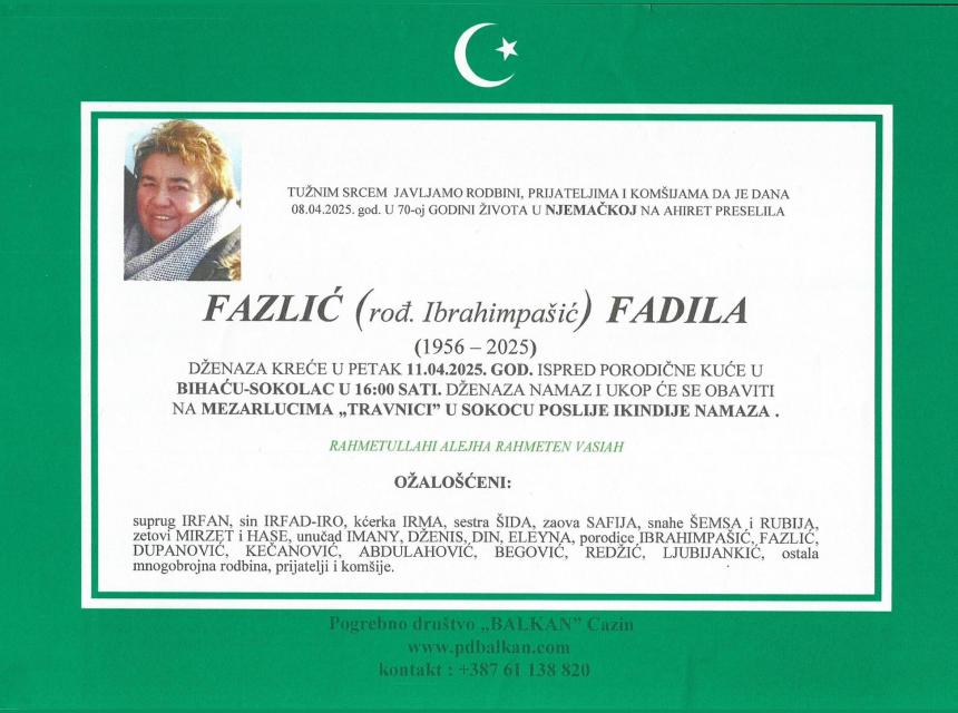 Tužnim srcem javljamo rodbini, prijateljima i komšijama da je dana 08.04.2025. god. u 70.-oj godini života na ahiret preselila Fazlić (rođ. Ibrahimpašić) Fadila.