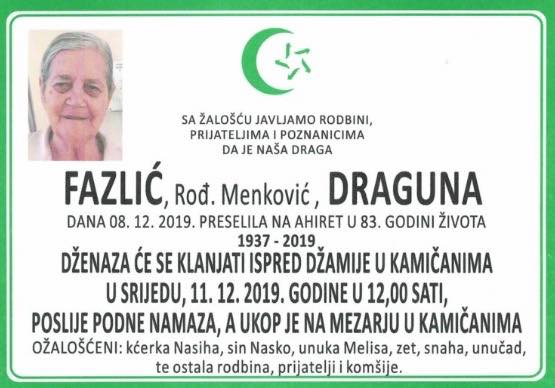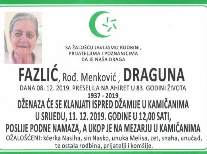 Sa tužnim srcem i bolom u duši, javljamo rodbini i prijateljima da je naša draga Fazlić (rođ. Menković) Draguna, dana 08.12.2019. godine u 83-oj godini života preselila na Ahiret.