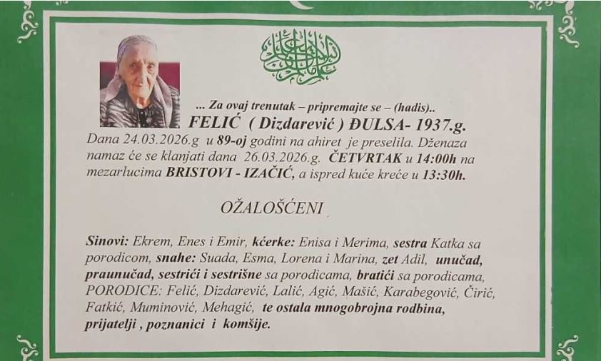 Dženaza namaz će se klanjati dana 26.03.2026.g. ČETVRTAK u 14:00h na mezarlucima BRISTOVI - IZAČIĆ, a ispred kuće kreće u 13:30h.