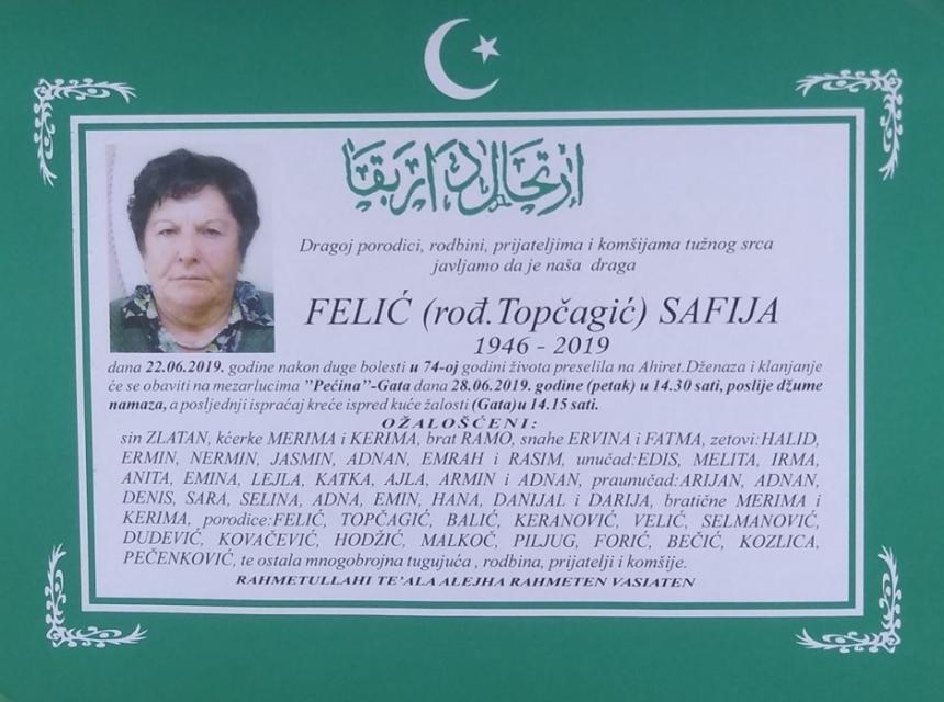 Dragoj porodici, rodbini, prijateljima i komšijama tužnog srca javljamo da je naša draga Felić (rođ.Topčagić) Safija, dana 22.06.2019. godine nakon duge bolesti u 74-oj godini žvota preselila na Ahiret.