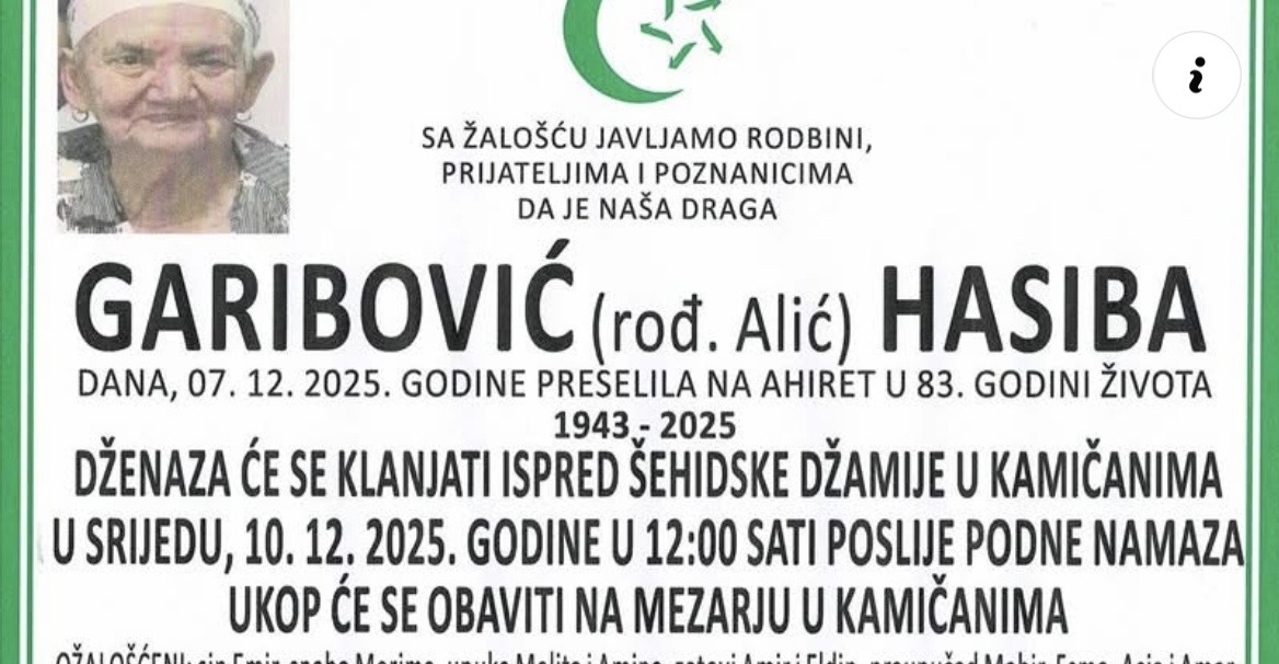 Dženaza će se klanjati ispred Šehidske džamije u Kamičanima u srijedu, 10. 12. 2025. godine u 12:00 sati, poslije podne-namaza.