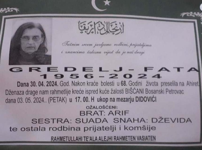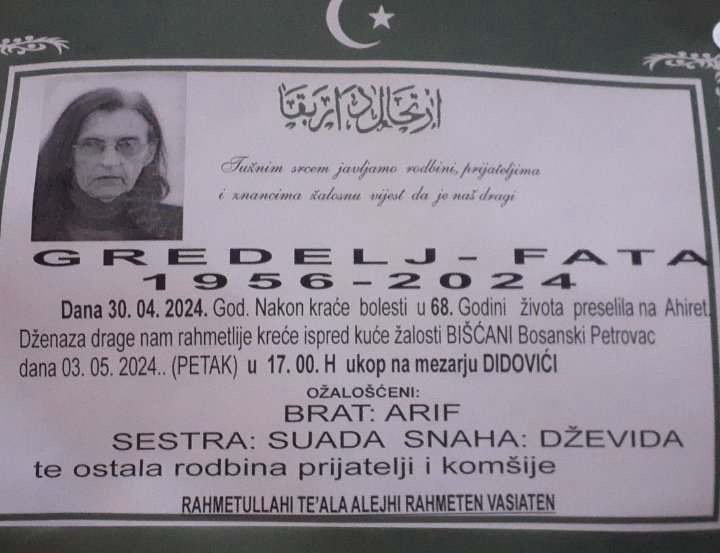 Tužnim srcem i bolom u duši javljamo rodbini, prijateljima i komšijama da je dana 30.04.2024. godine nakon kraće bolesti u 68-oj godini života iznenada na Ahiret preselila Gredelj Fata.