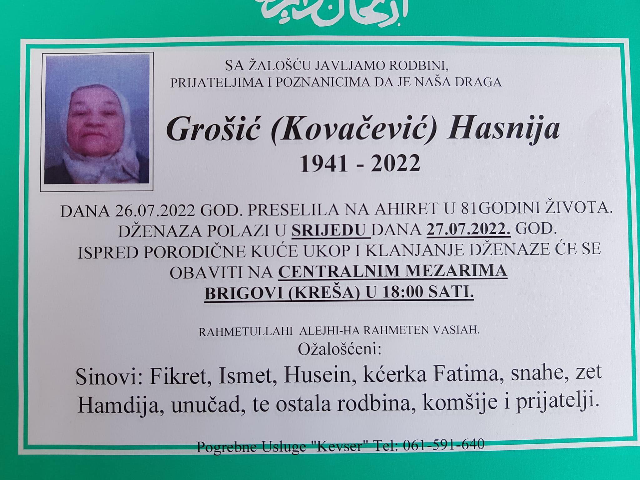 Tužnim srcem i bolom u duši javljamo rodbini, prijateljima i komšijama da je dana 26.07.2022.god. u 81. godini života na Ahiret preselila Grošić (Kovačević) Hasnija.