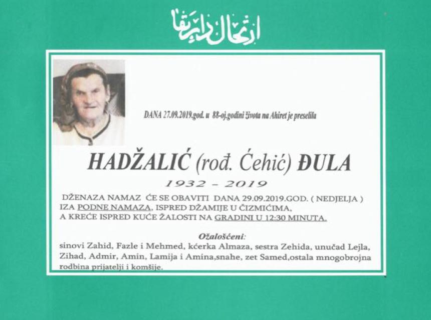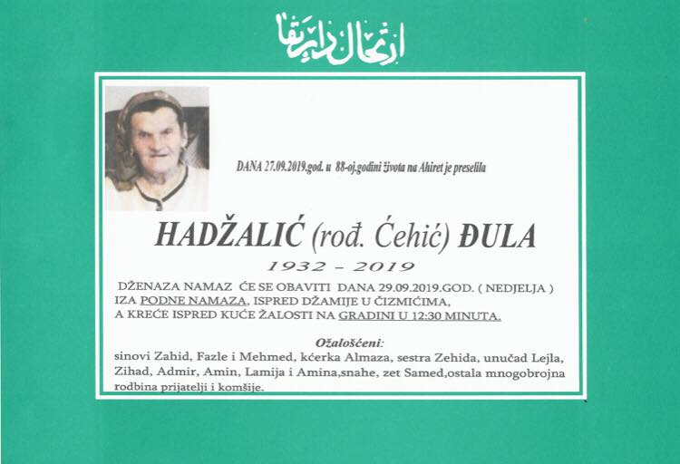 Dana 27.09.2019.godine u 88.-oj godini života na Ahiret je preselila Hadžalić (rođ. Ćehić) Đula.