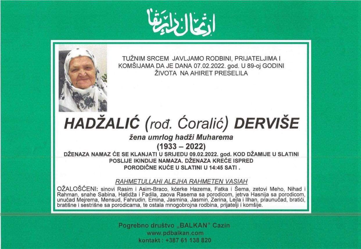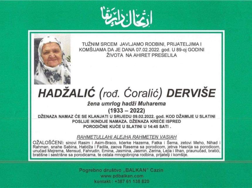 Tužnog srca i s bolom u duši obavještavamo rodbinu, komšije i prijatelje da je naša draga Hadžalić (rođ. Ćoralić) Derviše u 89. godini života dana 07.02.2022. preselila na ahiret.