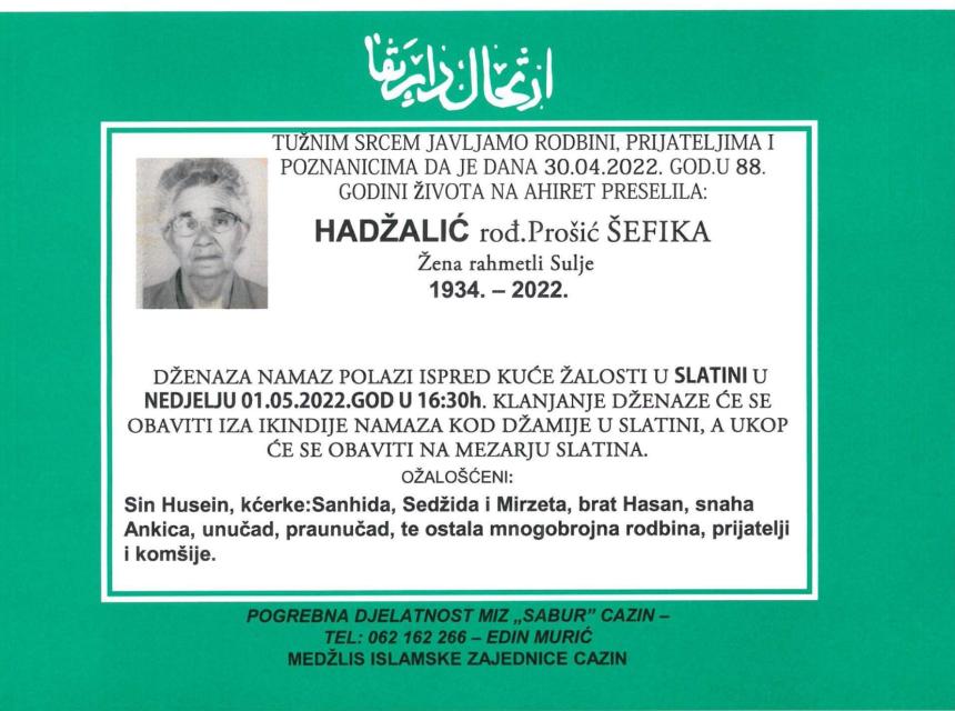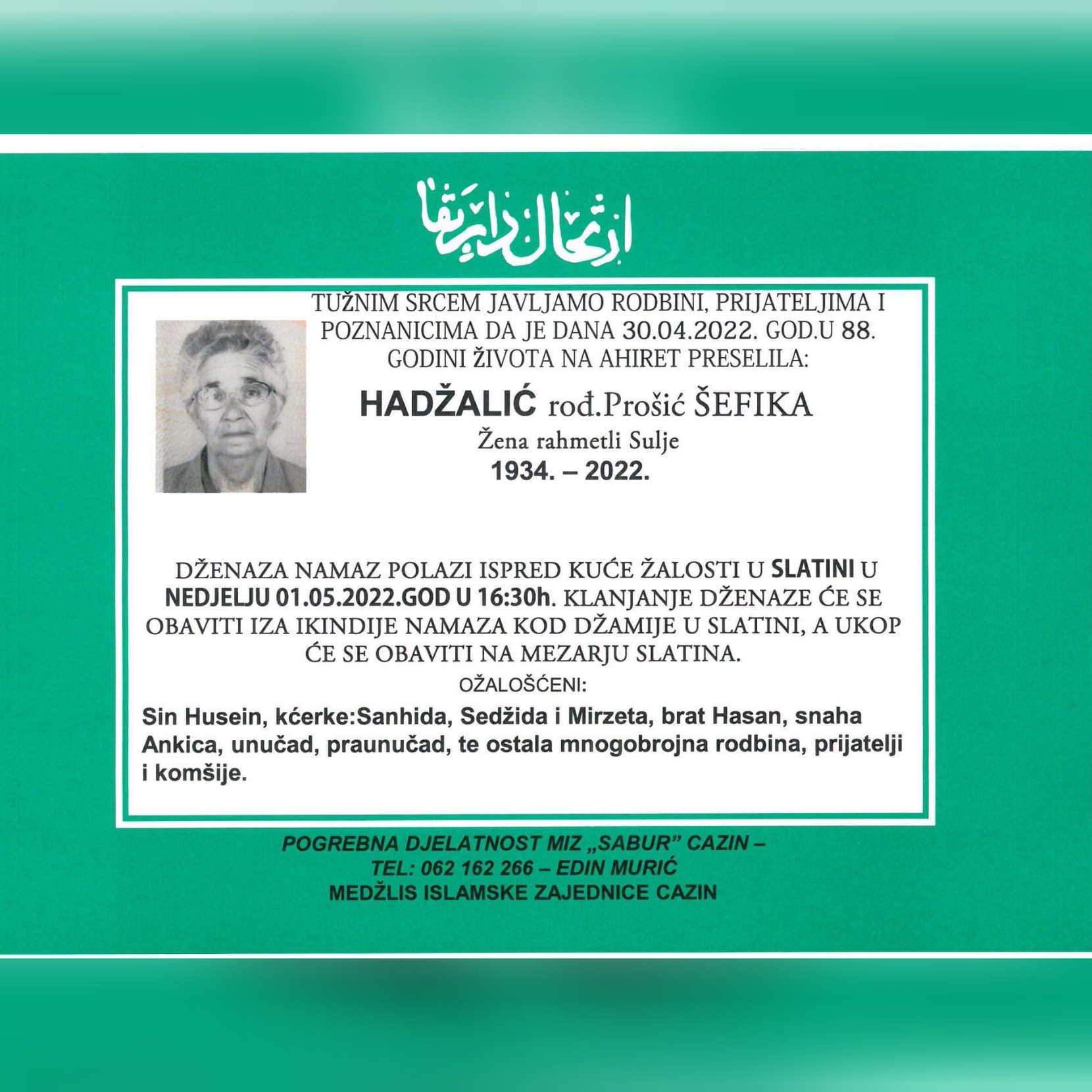 Tužnog srca i s bolom u duši obavještavamo rodbinu, komšije i prijatelje da je naša draga Hadžalić (rođ. Prošić) Šefika u 88. godini života preselila na Ahiret.