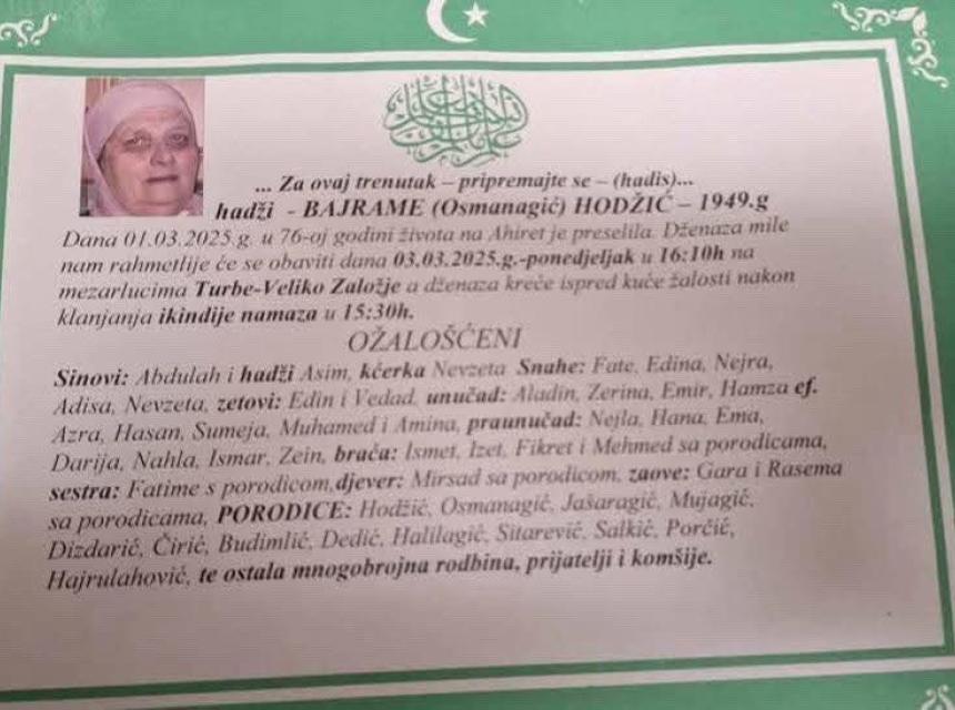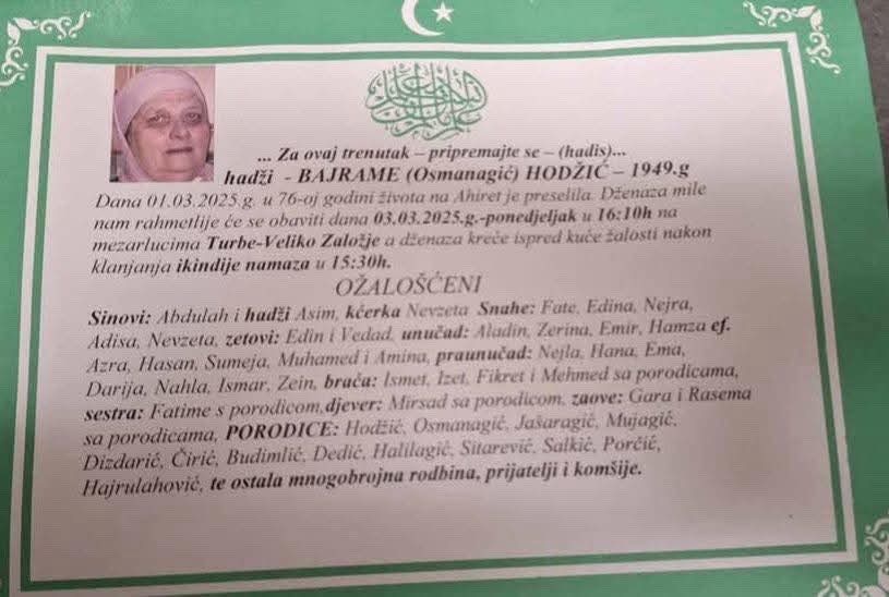 Dana 01.03.2025.g. u 76-oj godini života na Ahiret je preselila. Dženaza mile nam rahmetlije će se obaviti dana 03.03.2025.g.-ponedeljak u 16:10h na mezarlucima Turbe-Veliko Založje a dženaza kreće ispred kuće žalosti nakon klanjanja ikindije namaza u 15:30h.