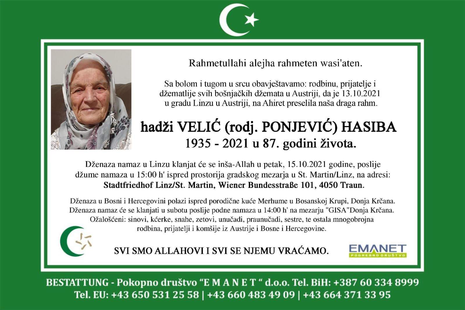 Dženaza će se klanjati u Linzu u petak, 15.10.2021., poslije džuma namaza u 15:00 sati ispred prostorija gradskog mezarja u St. Martin/Linz, na adresi: Stadtfriedhof Linz/St. Martin, Wiener Bundesstrase 101, 4050 Traun.