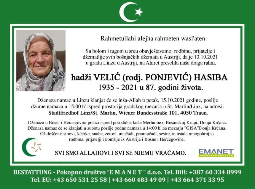Tužnog srca i s bolom u duši obavještavamo rodbinu, komšije i prijatelje da je naša draga hadži Velić (rođ. Ponjević) Hasiba dana 13.10.2021. godine, u 87. godini života, preselila na ahiret.