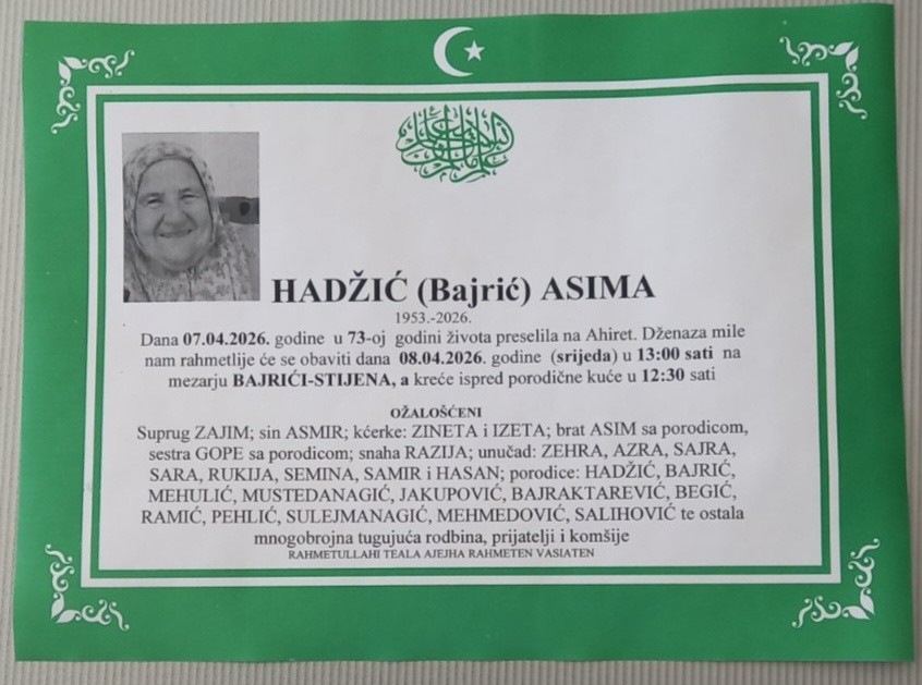 Dženaza mile nam rahmetlije će se obaviti dana 08.04.2026. godine (srijeda) u 13:00 sati na mezarju BAJRIĆI-STIJENA, a kreće ispred porodične kuće u 12:30 sati.