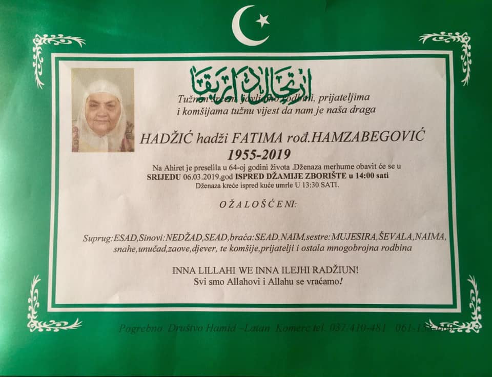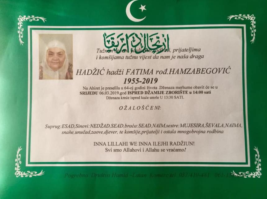 Tužnim srcem i bolom u duši javljamo rodbini, komšijama i prijateljima da je u 64.-oj godini života, na Ahiret preselila naša draga Hadžić Hadži Fatima (rođ. Hamzabegović).