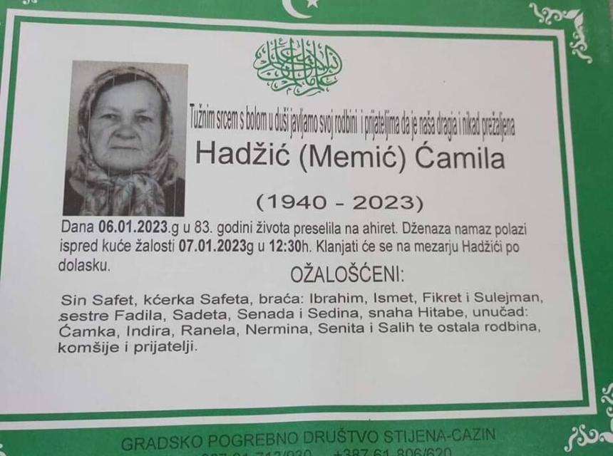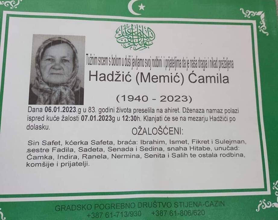 Tužnim srcem i bolom u duši javljamo rodbini, prijateljima, komšijama i poznanicima da je dana 06.01.2023. godine u 83-oj godini života na Ahiret preselila Hadžić (Memić) Ćamila.