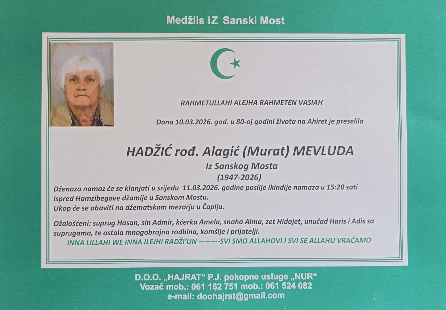 Dženaza-namaz će se klanjati u srijedu 11.03.2026. godine poslije ikindije namaza u 15:20 sati, ispred Hamzibegove džamije u Sanskom Mostu.