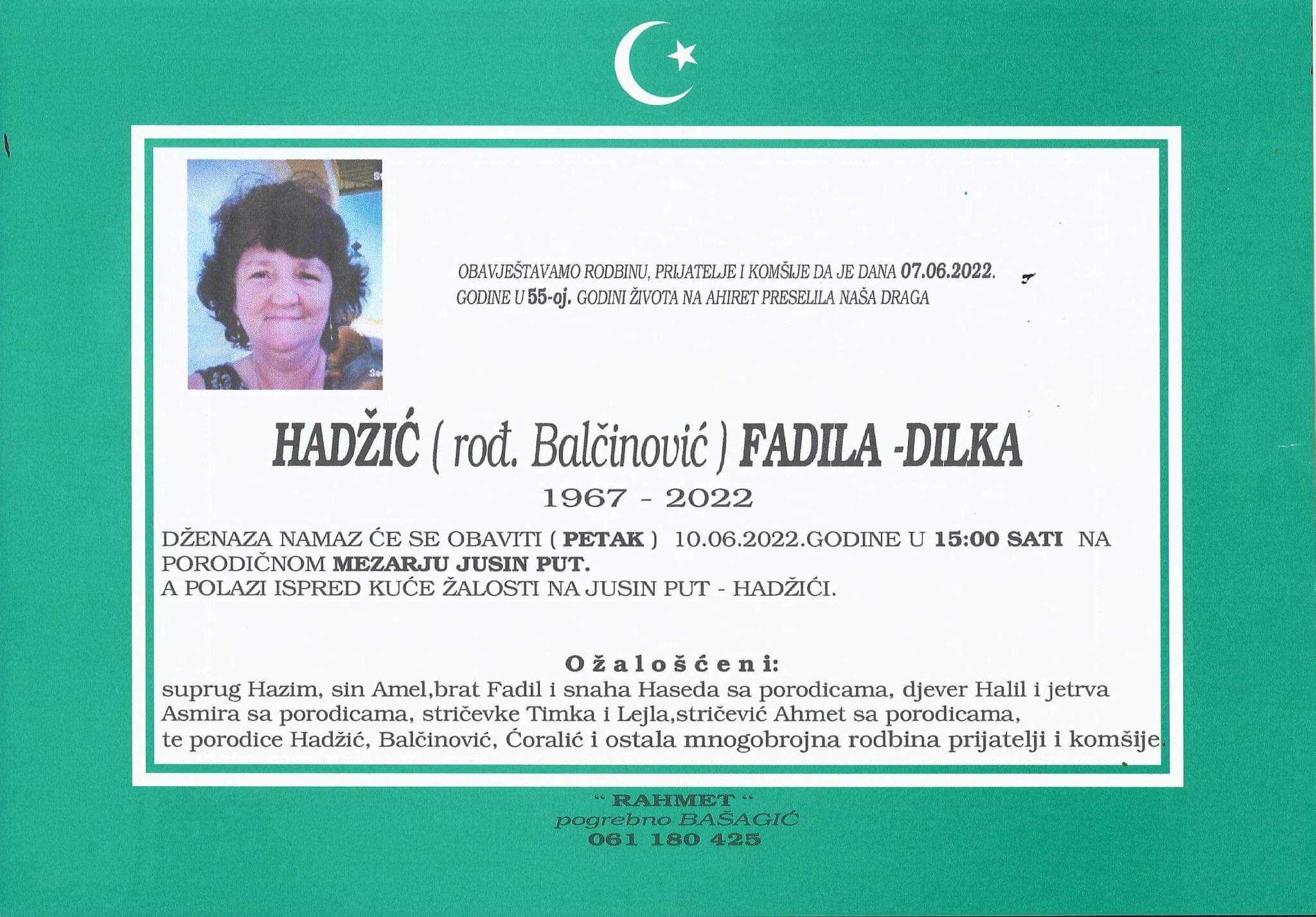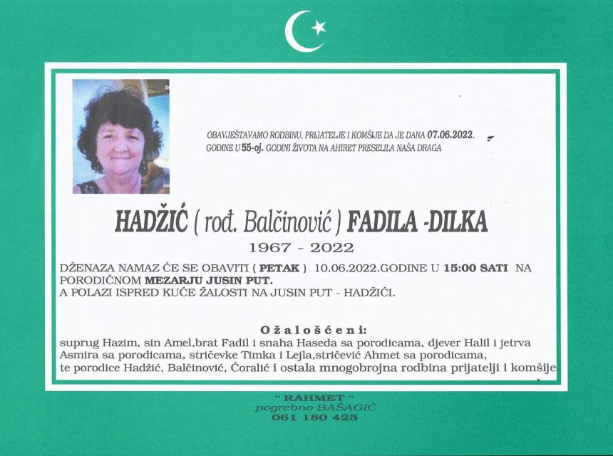 Tužnog srca i s bolom u duši obavještavamo rodbinu, komšije i prijatelje da je naša draga Hadžić (rođ. Balčinović) Fadila- Dilka u 55. godini života preselila na Ahiret.