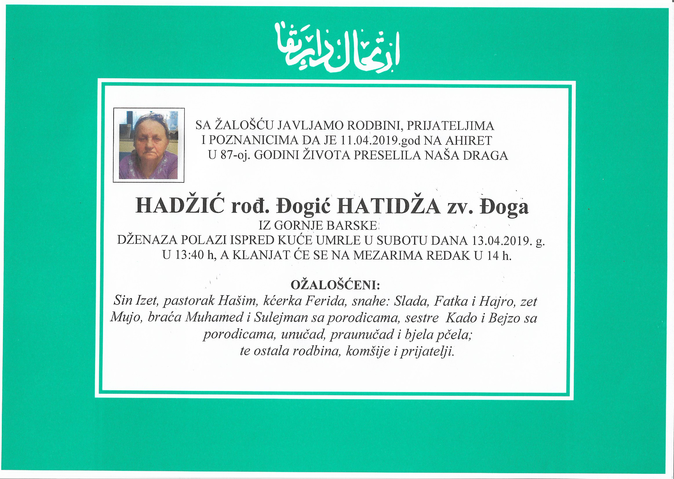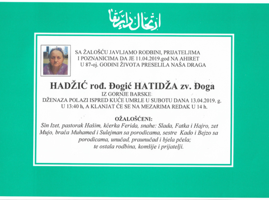 Tužnim srcem i bolom u duši javljamo rodbini, prijateljima i komšijama da je dana 11.04.2019. godine u 87-oj godini života na Ahiret preselila Hadžić (rođ. Đogić) Hatidža zv. Đoga.