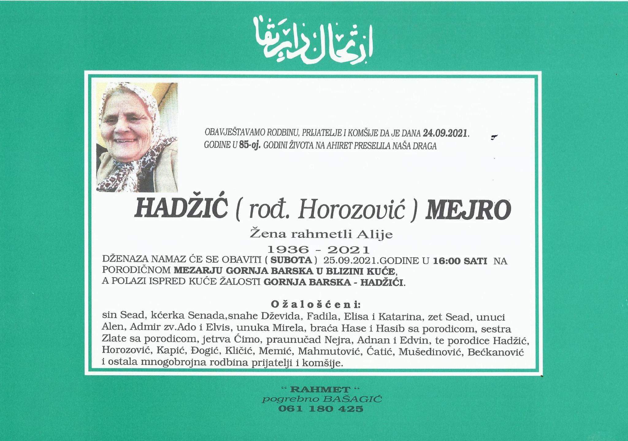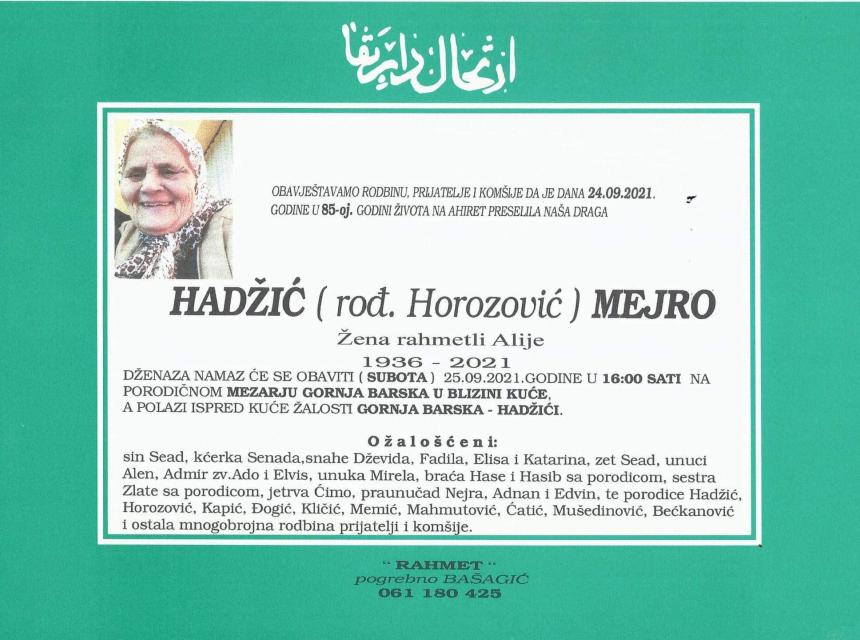 Tužnog srca i s bolom u duši obavještavamo rodbinu, komšije i prijatelje da je naša draga Hadžić (rođ. Horozović) Mejro dana 24.09.2021. godine, u 85. godini života, preselila na ahiret.
