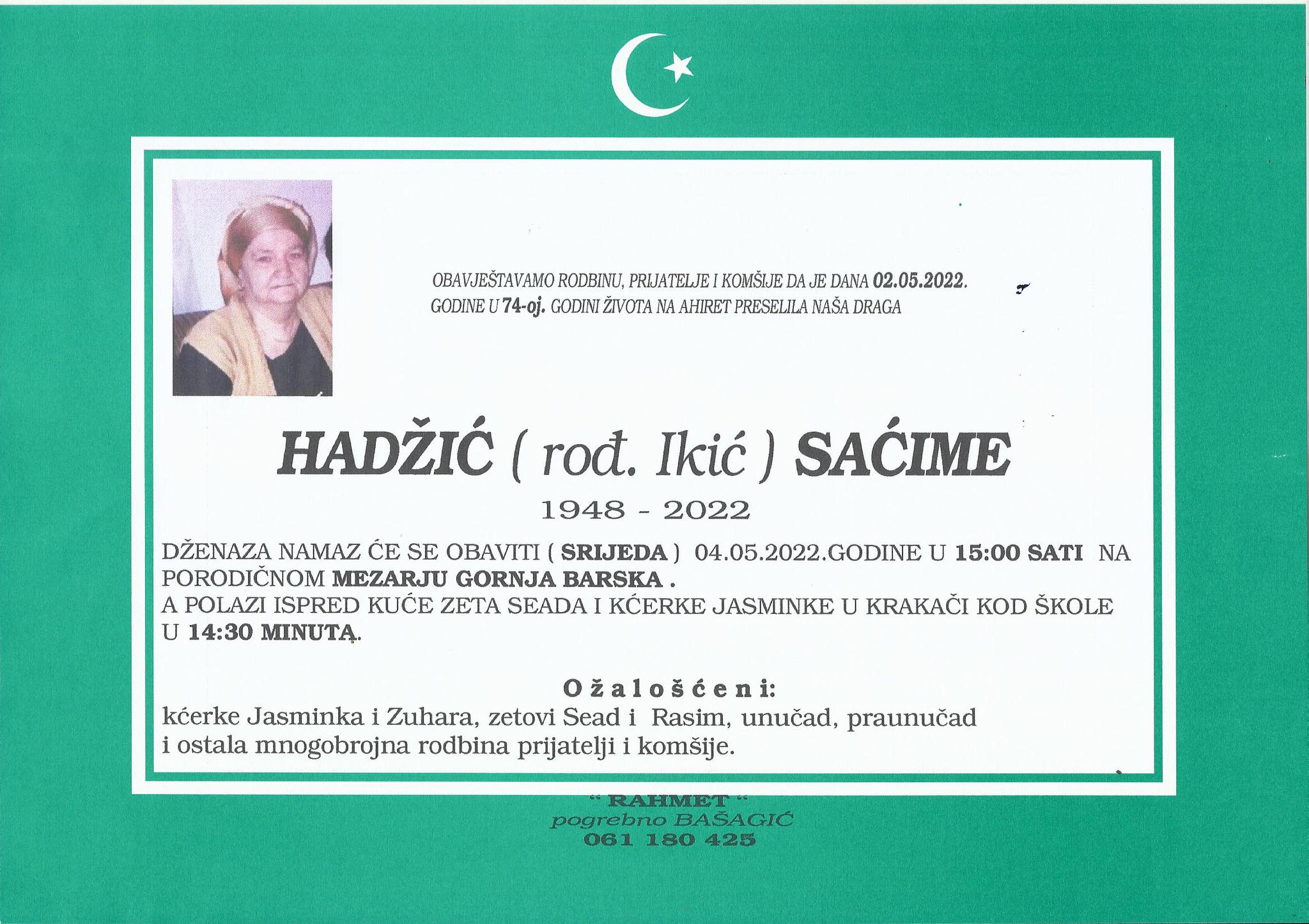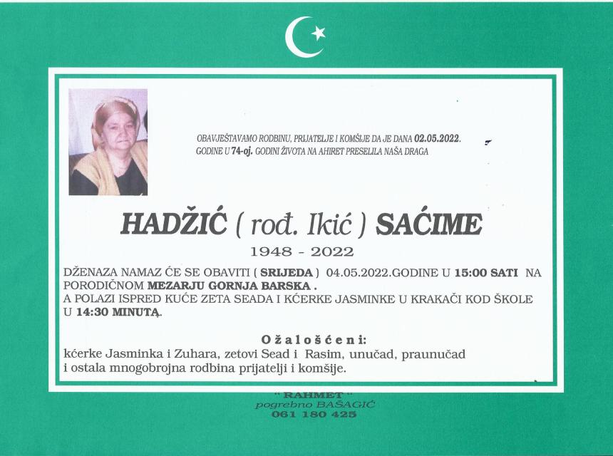 Tužnog srca i s bolom u duši obavještavamo rodbinu, komšije i prijatelje da je naša draga Hadžić (rođ. Ikić) Saćime u 74. godini života preselila na Ahiret.