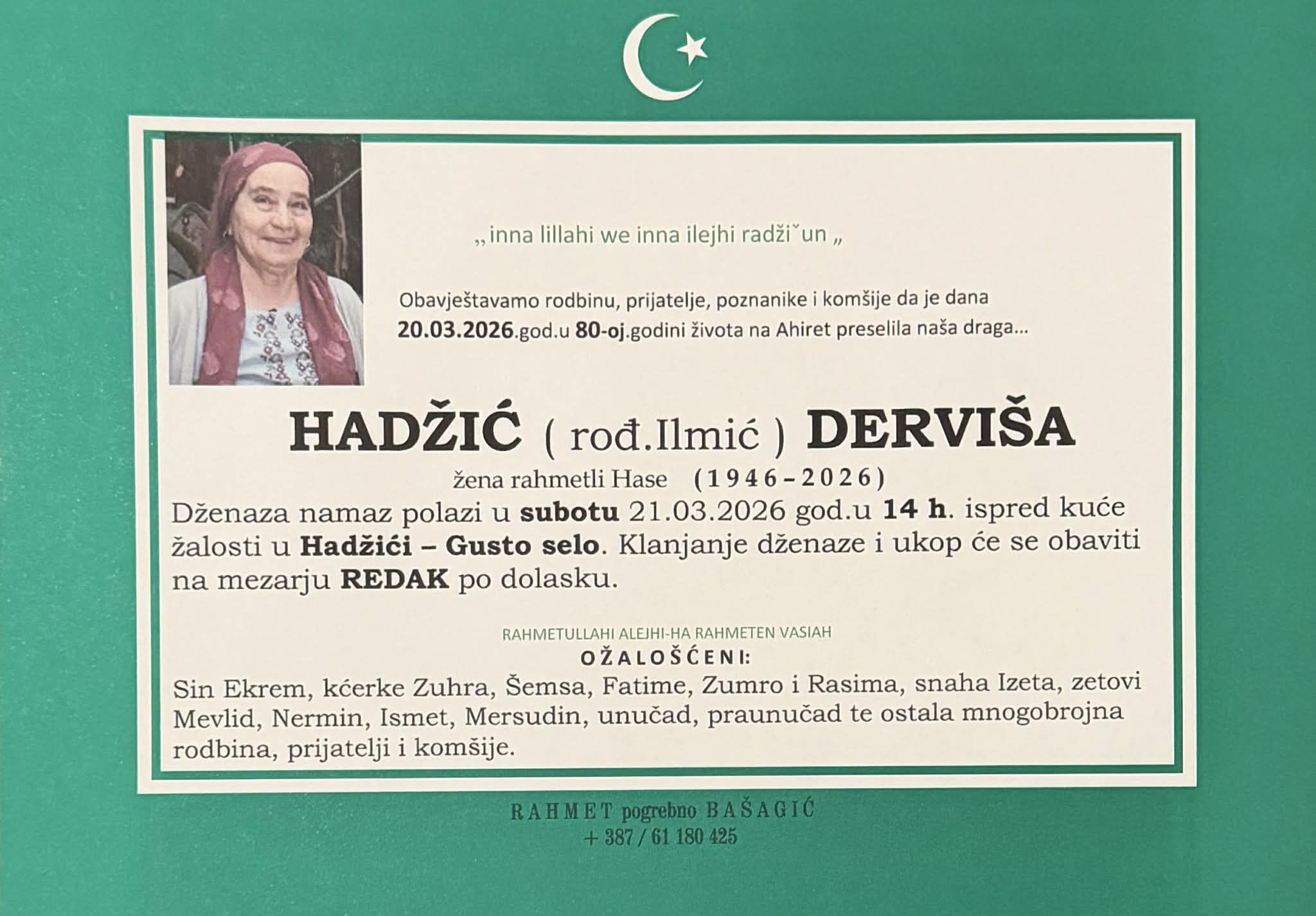 Dženaza namaz polazi u subotu 21.03.2026 god.u 14 h. ispred kuće žalosti u Hadžići - Gusto selo. Klanjanje dženaze i ukop će se obaviti na mezarju REDAK po dolasku.