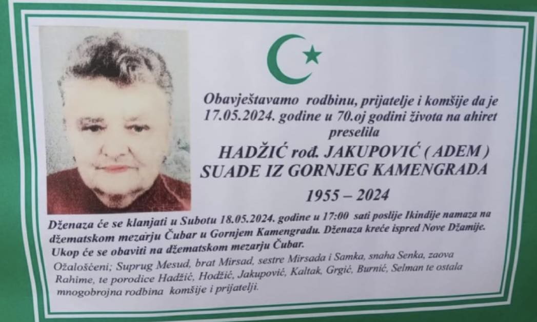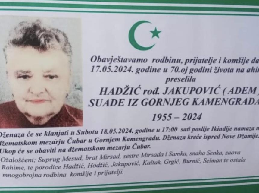 Obavještavamo rodbinu, prijatelje, poznanike i komšije da je dana 17.05.2024. god. 70-oj.godini života na Ahiret preselila naša draga Hadžić rođ. Jakupović (Adem) Suade.