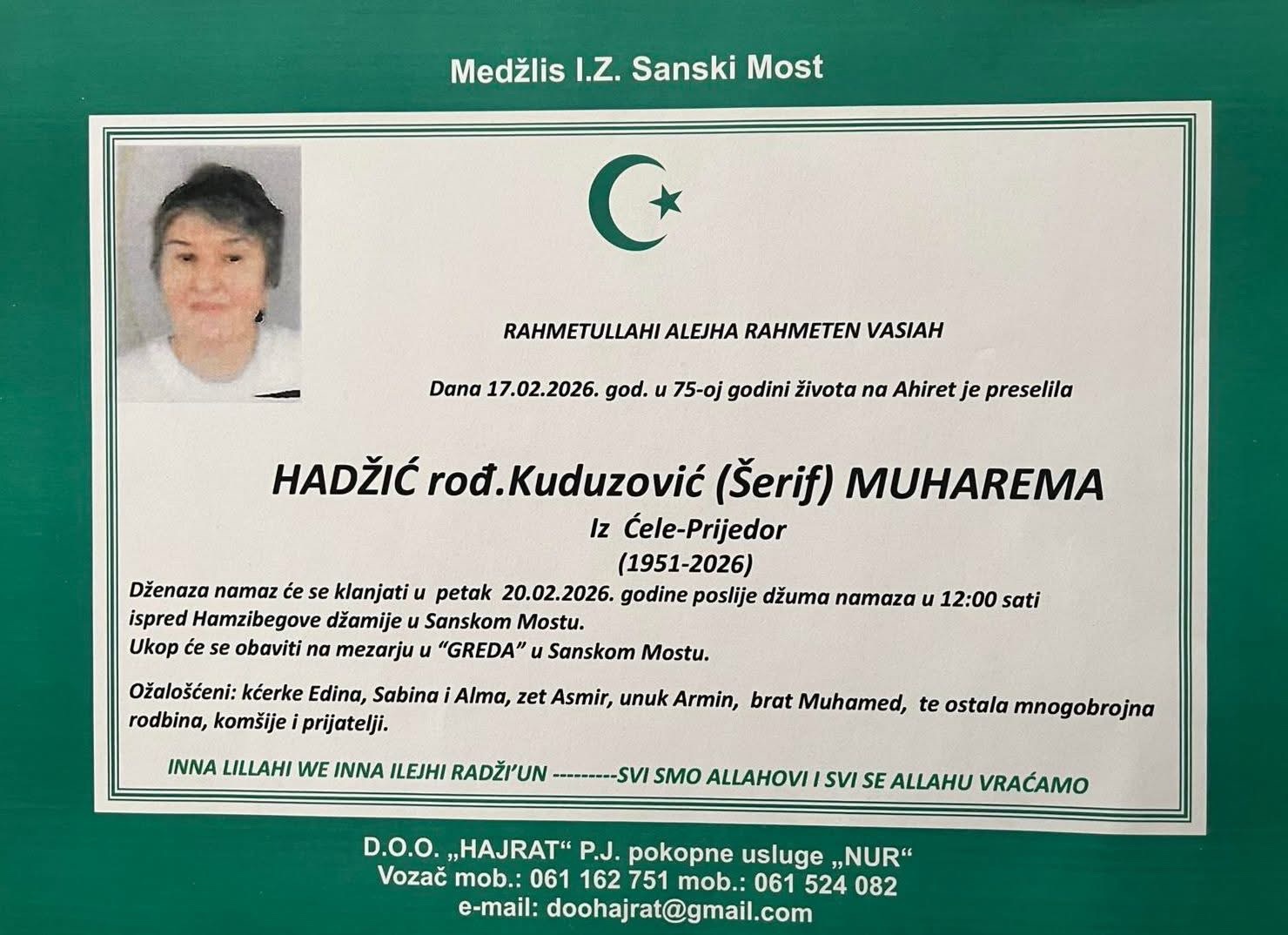 Dženaza namaz će se klanjati u petak 20.02.2026. godine poslije džuma namaza u 12:00 sati ispred Hamzibegove džamije u Sanskom Mostu.