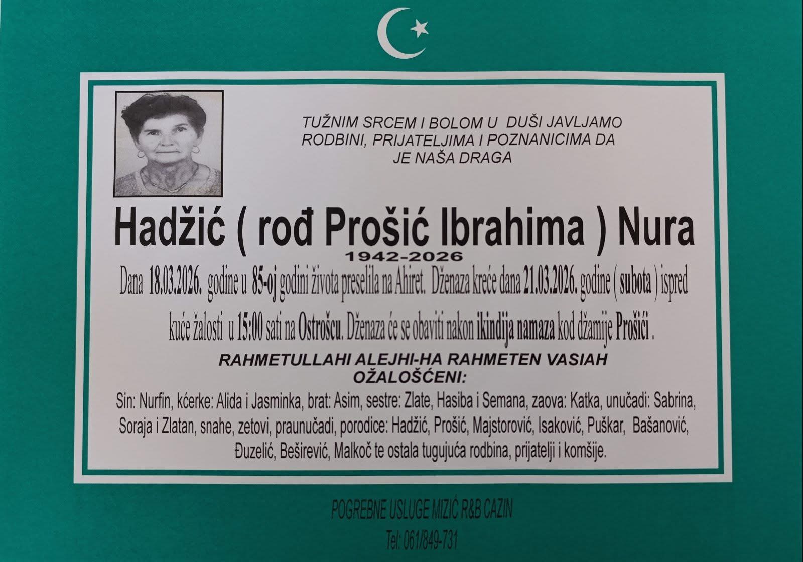 Dženaza kreće dana 21.03.2026. godine (subota) ispred kuće žalosti u 15:00 sati na Ostrošcu. Dženaza će se obaviti nakon ikindija-namaza kod džamije u Prošićima.