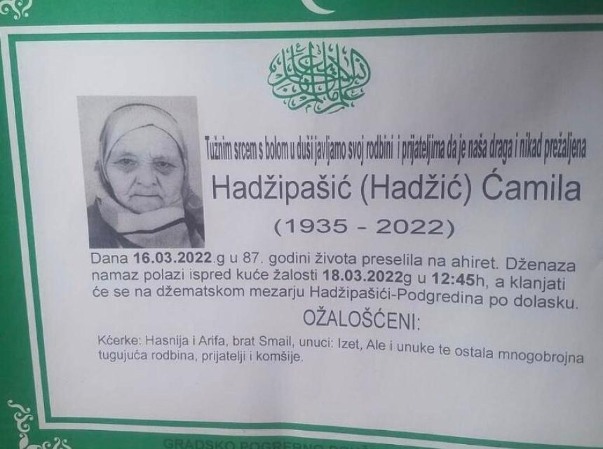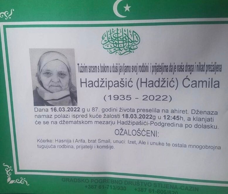 Tužnog srca i s bolom u duši obavještavamo rodbinu, komšije i prijatelje da je naša draga Hadžipašić (Hadžić) Ćamila, dana 16.03.2022. godine, u 87-oj godini života, preselila na Ahiret.