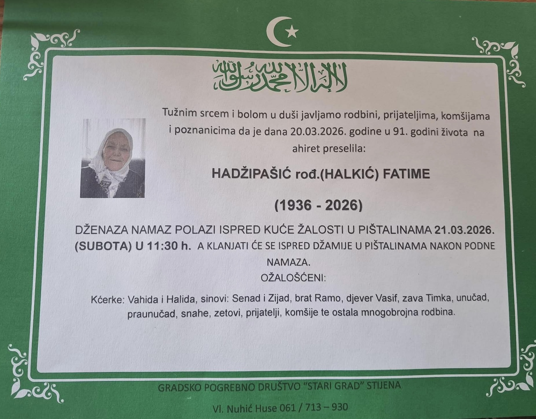 Dženaza-namaz polazi ispred kuće žalosti u Pištalinama 21.03.2026. (subota) u 11:30 sati, a klanjat će se ispred džamije u Pištalinama nakon podne-namaza.