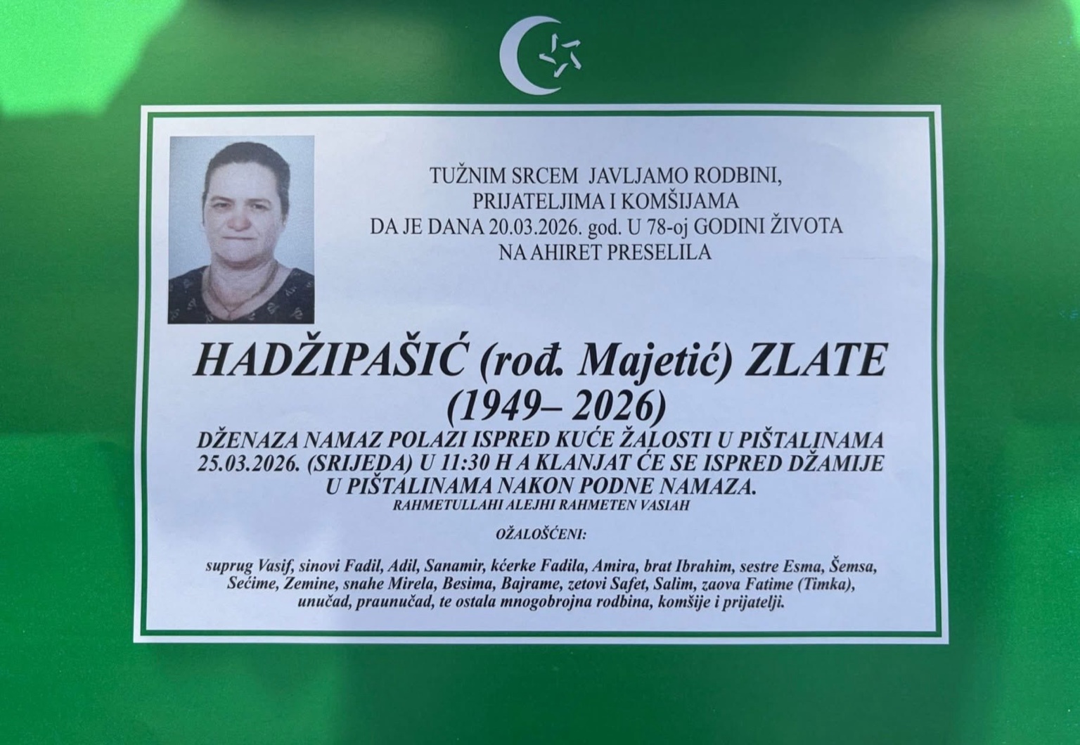 Dženaza-namaz polazi ispred kuće žalosti u Pištalinama 25.03.2026. (srijeda) u 11:30 h, a klanjat će se ispred džamije u Pištalinama nakon podne namaza.
