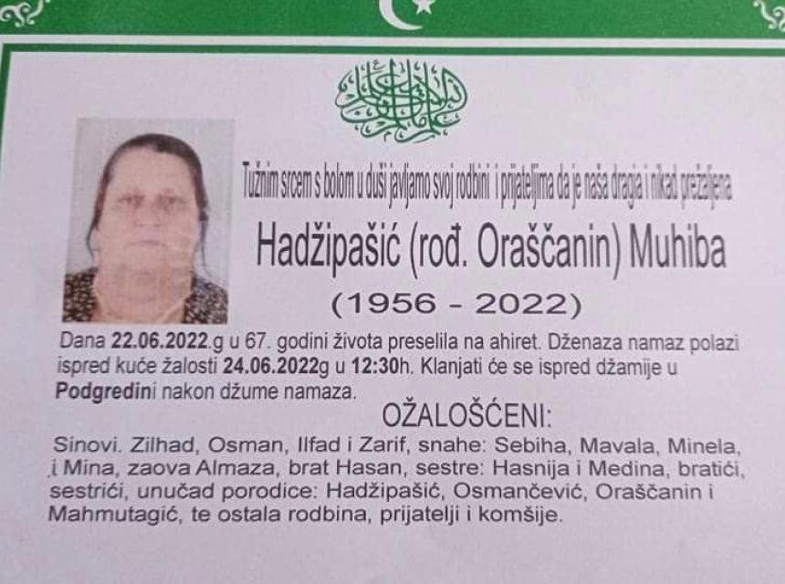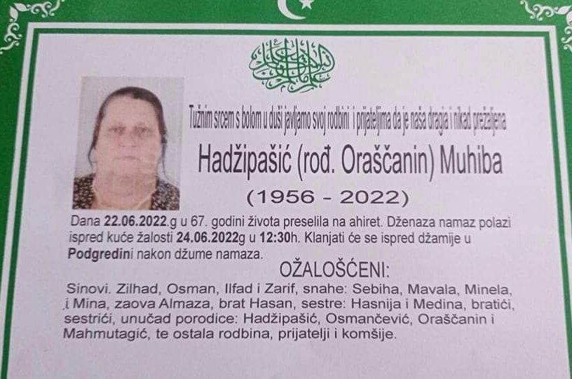 Tužnog srca i s bolom u duši obavještavamo rodbinu, komšije i prijatelje da je naša draga Hadžipašić (rođ. Oraščanin) Muhiba preselila na Ahiret.