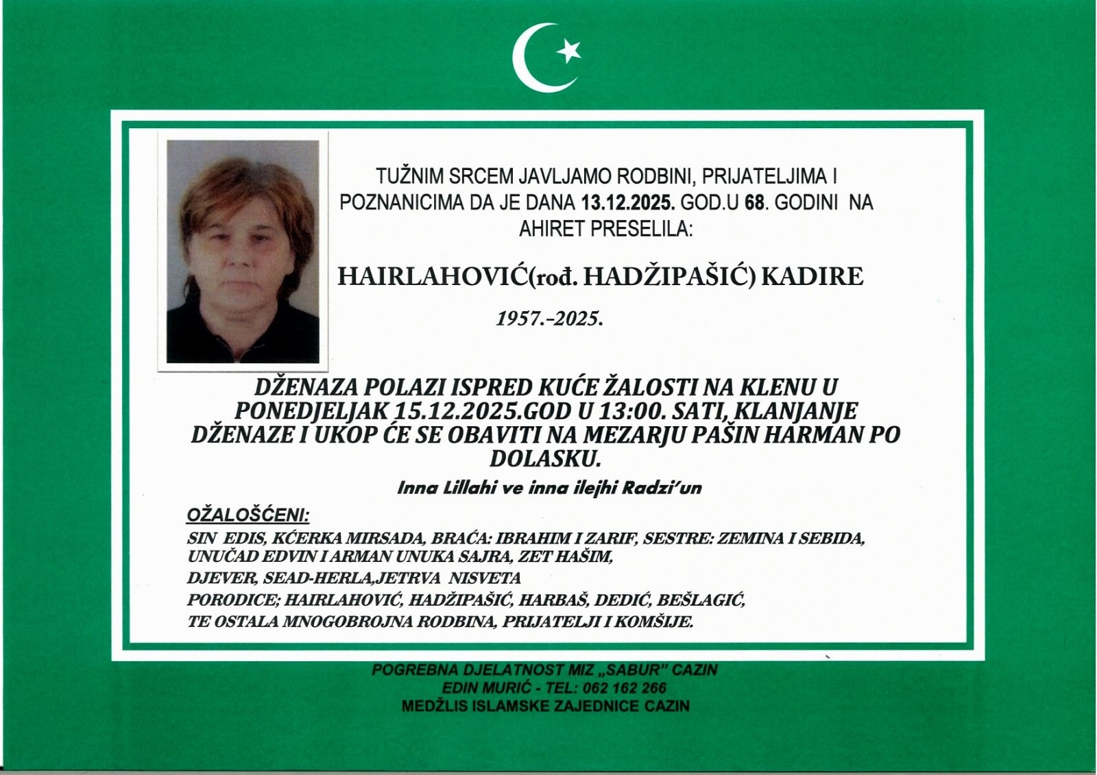 TUŽNIM SRCEM JAVLJAMO RODBINI, PRIJATELJIMA I POZNANICIMA DA JE DANA 13.12.2025. GOD. U 68. GODINI NA AHIRET PRESELILA HAIRLAHOVIĆ (rođ. HADŽIPAŠIĆ) KADIRE.
