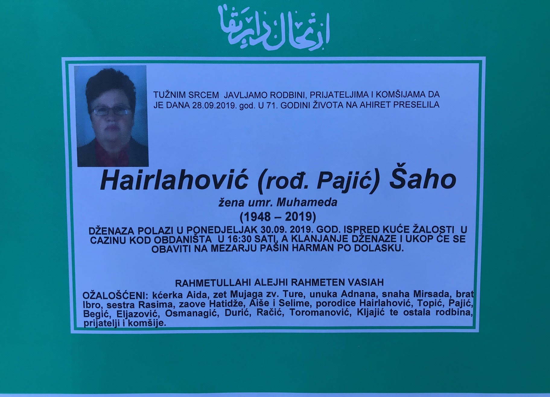 Tužnim srcem javljamo rodbini, prijateljima i komšijama da je dana 28.09.2019.god. u 71. godini života na Ahiret preselila Hairlahović (rođ. Pajić) Šaho žena umr. Muhameda. Dženaza polazi u ponedjeljak 30.09.2019. god. ispred kuće žalosti u Cazinu kod obdaništa u 16:30 sati, a klanjanje dženaze i ukop će se obaviti na mezarju Pašin Harman po dolasku.