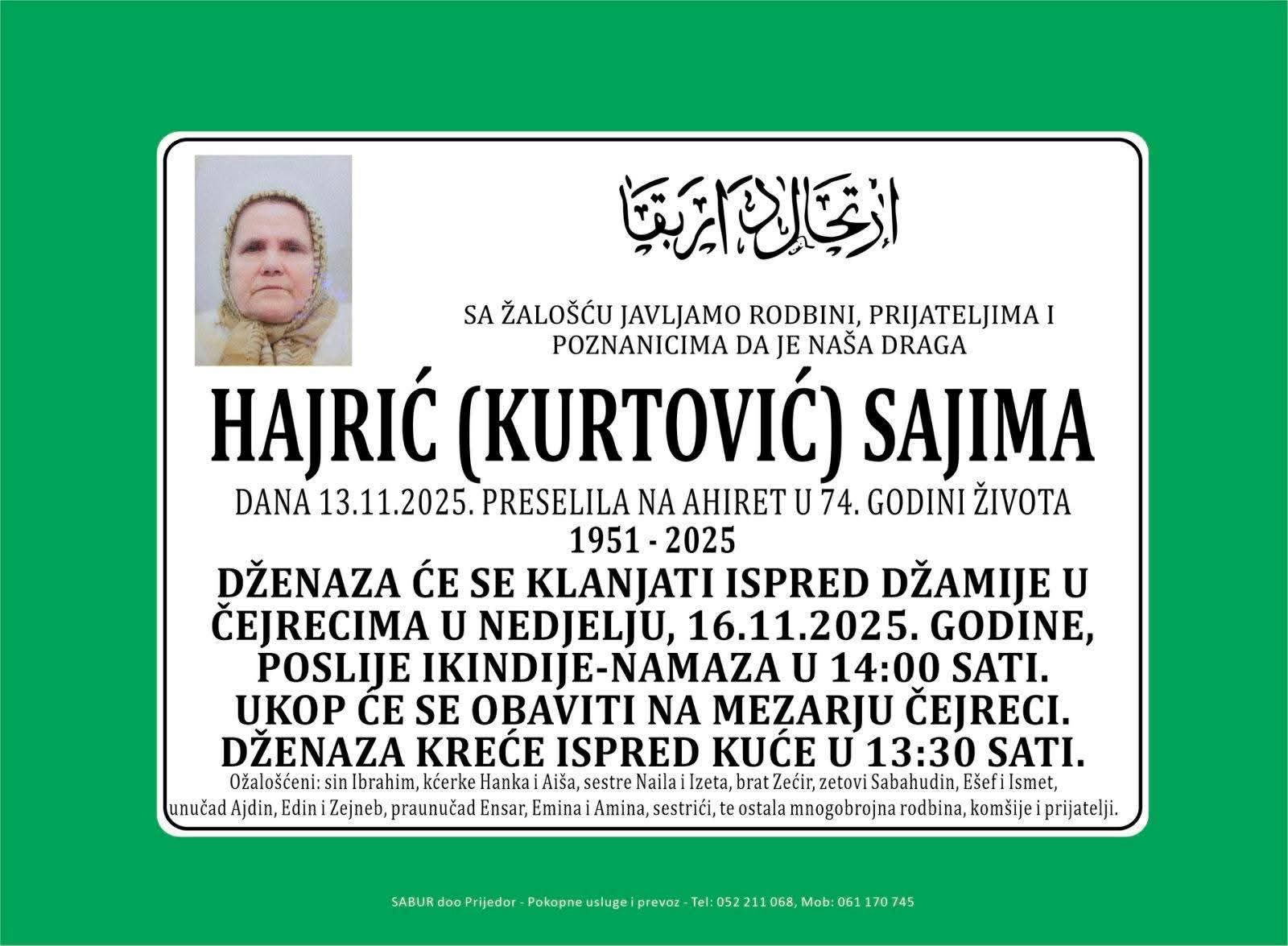 Dženaza će se klanjati ispred džamije u Čejrecima u nedjelju, 16.11.2025. godine, poslije ikindije-namaza u 14:00 sati.