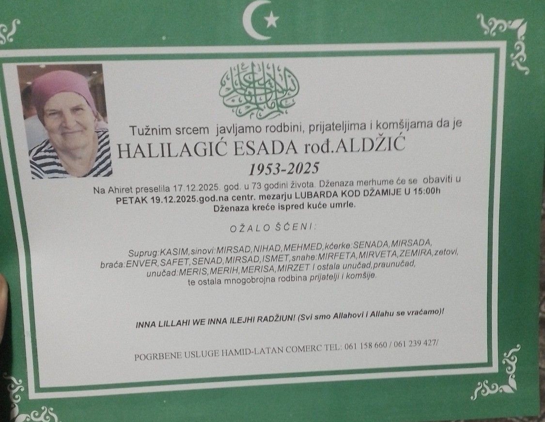 Tužnim srcem javljamo rodbini, prijateljima i komšijama da je HALILAGIĆ ESADA rođ. ALDŽIĆ na Ahiret preselila 17.12.2025. god. u 73. godini života.