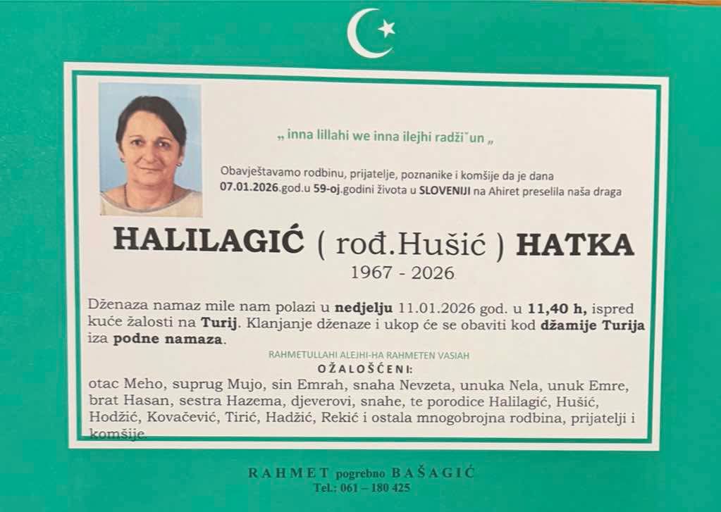 Dženaza namaz mile nam polazi u nedjelju 11.01.2026. godine u 11:40 h, ispred kuće žalosti na Turiji. Klanjanje dženaze i ukop će se obaviti kod džamije Turija iza podne namaza.