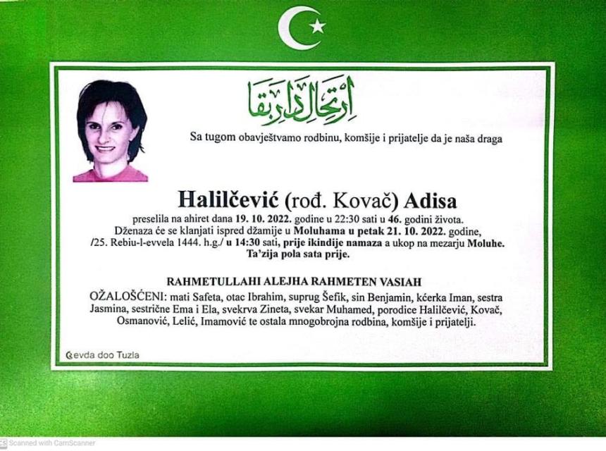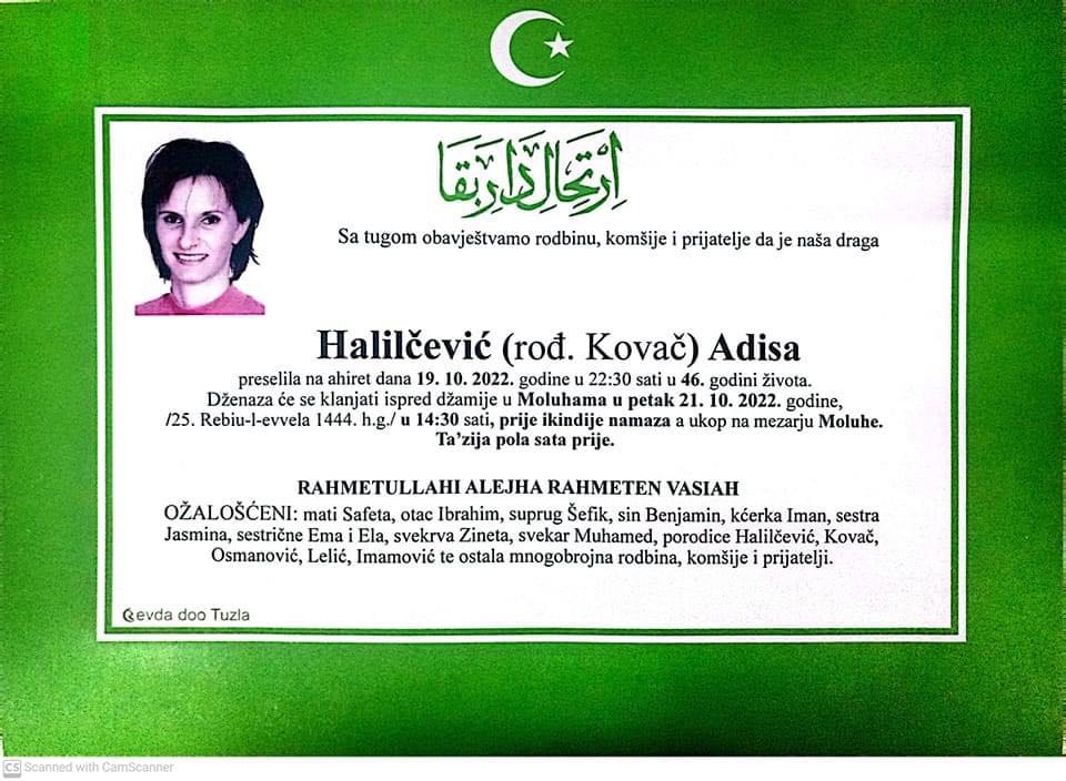 Tužnim srcem i bolom u duši javljamo rodbini, prijateljima i komšijama da je naša Halilčević (rođ. Kovač) Adisa, dana 19.10.2022. godine u 46-oj godini života, preselila na Ahiret.