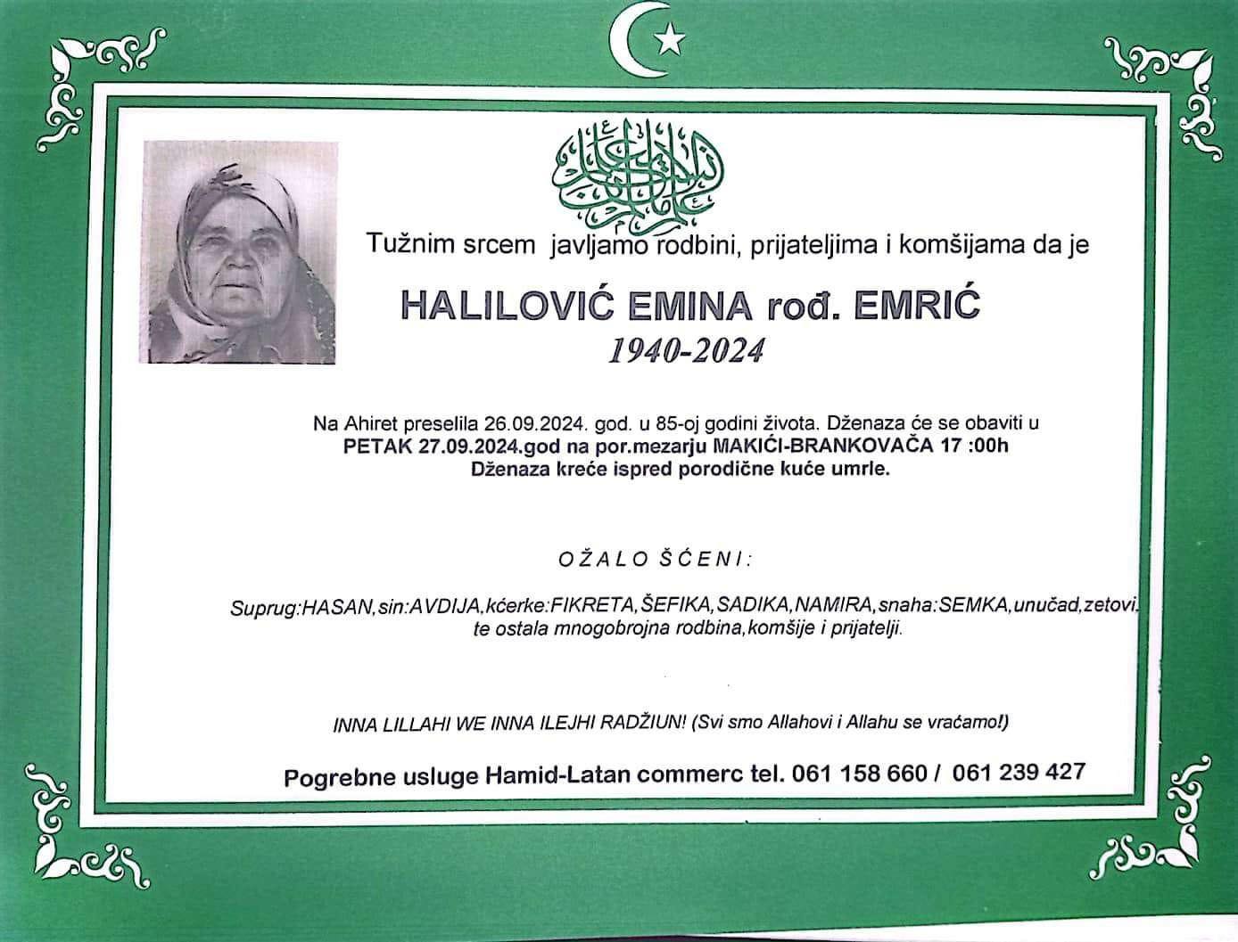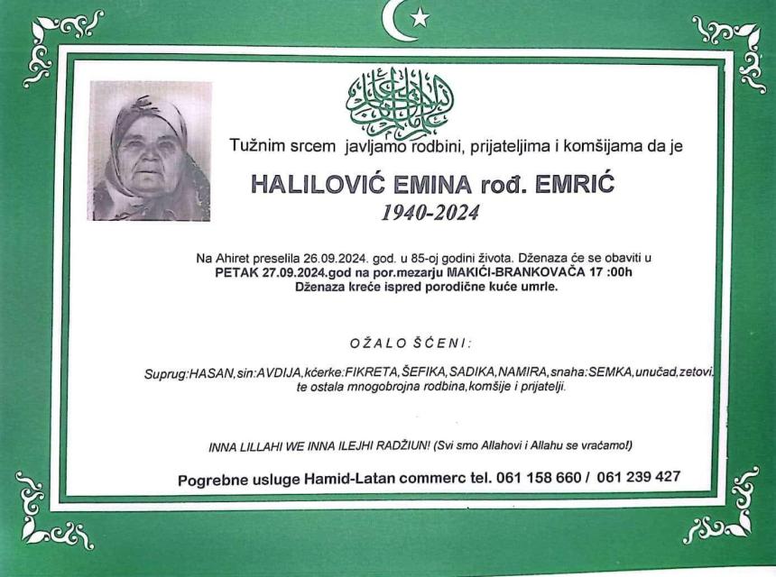 Tužnim srcem i bolom u duši javljamo rodbini, prijateljima i komšijama da je naša draga Halilović Emina rođ. Emrić, dana 26.09.2024. godine u 85-oj godini života, preselila na ahiret.