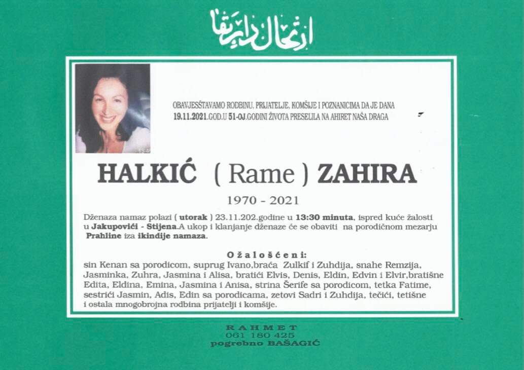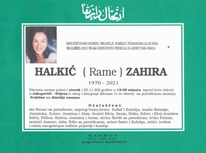 Tužnog srca i s bolom u duši obavještavamo rodbinu, komšije i prijatelje da je naša draga Halkić (Rame) Zahira dana 19.11.2021. u 51. godini života preselila na ahiret.