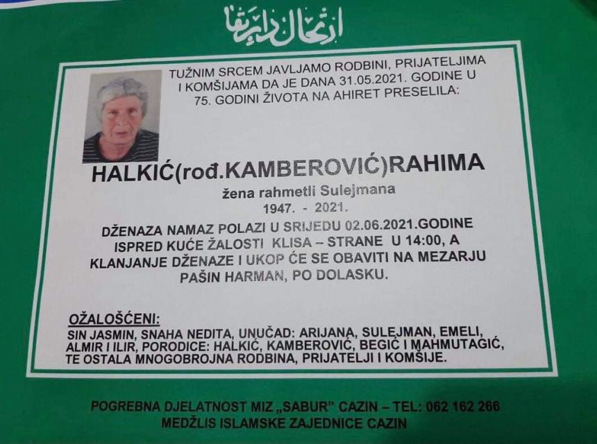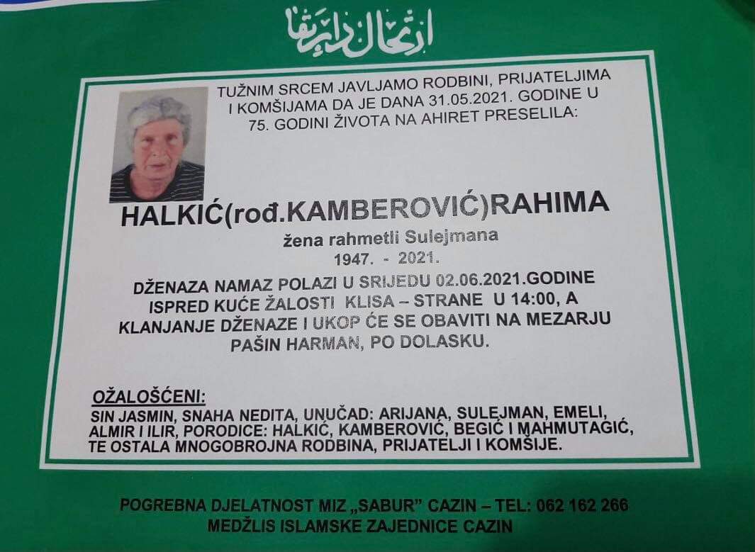 Tužnog srca i s bolom u duši obavještavamo rodbinu, komšije i prijatelje da je naša draga Halkić (rođ. Kamberović) Rahima dana 31.05.2021. godine, u 75. godini života, preselila na ahiret.