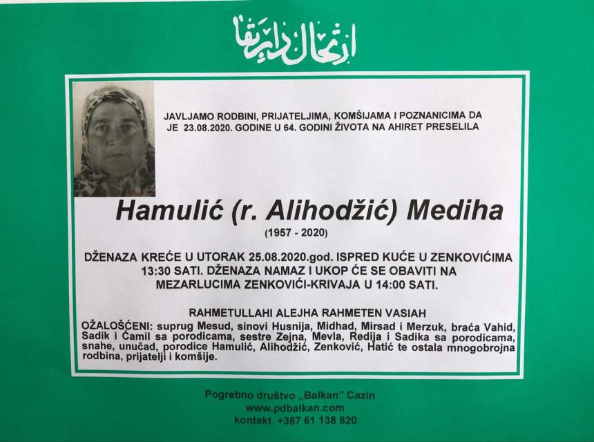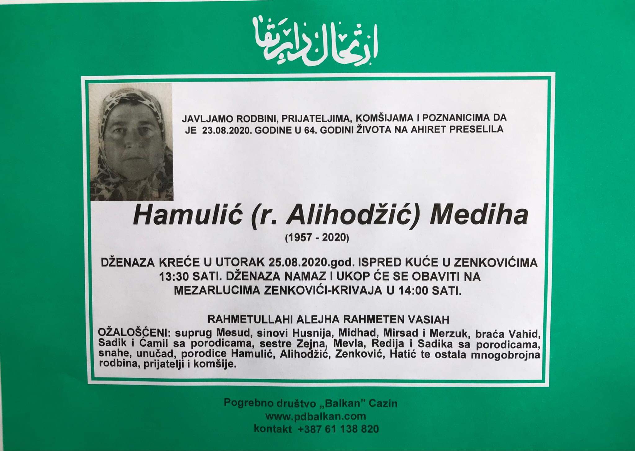 Tužnog srca i s bolom u duši obavještavamo rodbinu, komšije i prijatelje da je naša draga Hamulić (r. Alihodžić) Mediha, dana 23.08.2020. godine, u 64-oj. godini života, preselila na Ahiret.