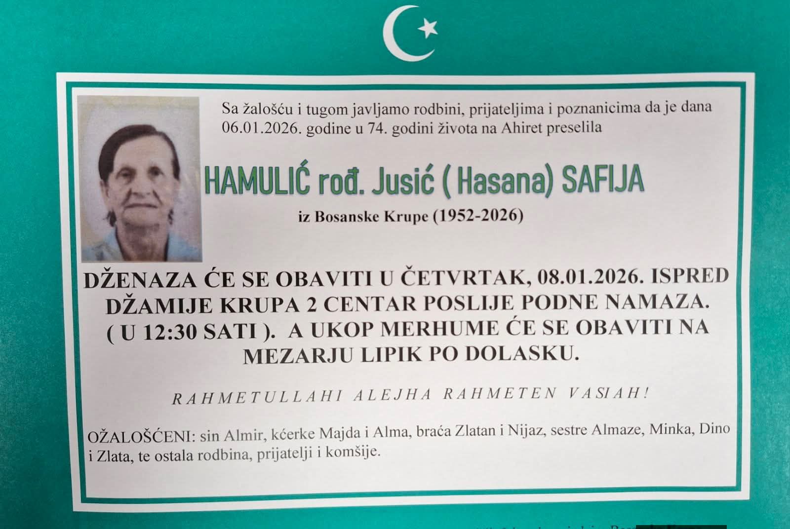 DŽENAZA ĆE SE OBAVITI U ČETVRTAK, 08.01.2026. ISPRED DŽAMIJE KRUPA 2 CENTAR POSLIJE PODNE NAMAZA (U 12:30 SATI), A UKOP MERHUME ĆE SE OBAVITI NA MEZARJU LIPIK PO DOLASKU.