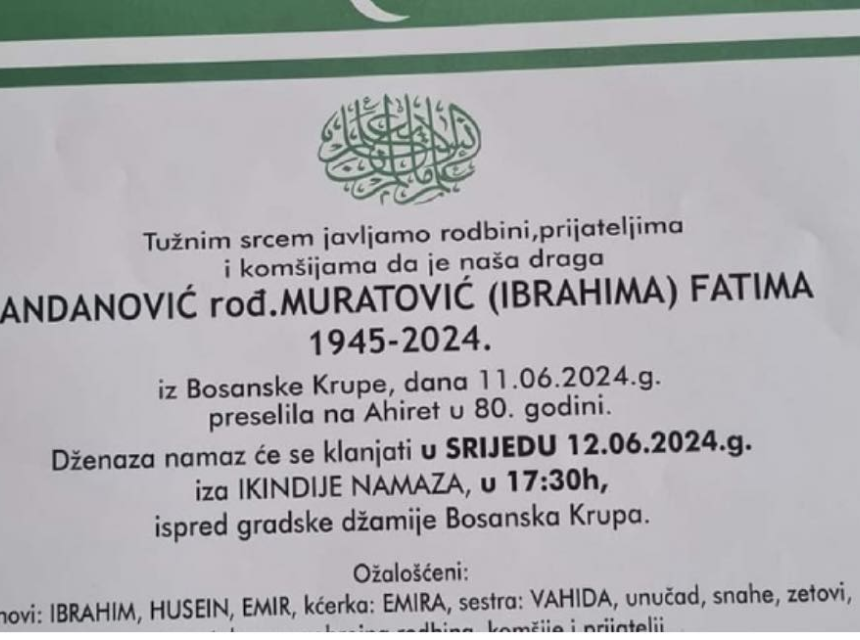 Dženaza namaz će se klanjati u srijedu 12.06.2024.g. iza ikindije namaza u 17:30h.
