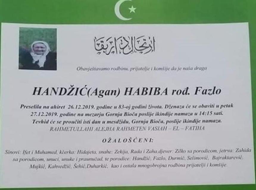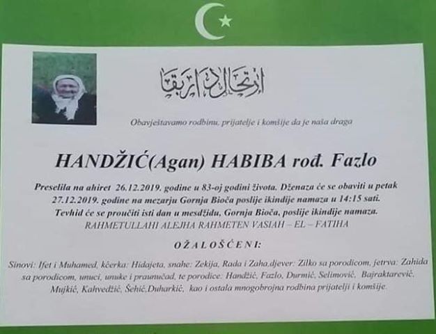 Obaviještavamo rodbinu, prijatelje i komšije da je naša draga Handžalić (Agan) Habiba rođ. Fazlo preselila na Ahiret 26.12.2019. godine u 83-oj godini života. Dženaza će se obaviti u petak 27.12.2019. godine na mezarju Gornja Bioča poslije ikindije namaza u 14:15 sati. Tevhid će se proučiti isti dann u mesdžidu, Gornja Bioča, poslije ikindije namaza.