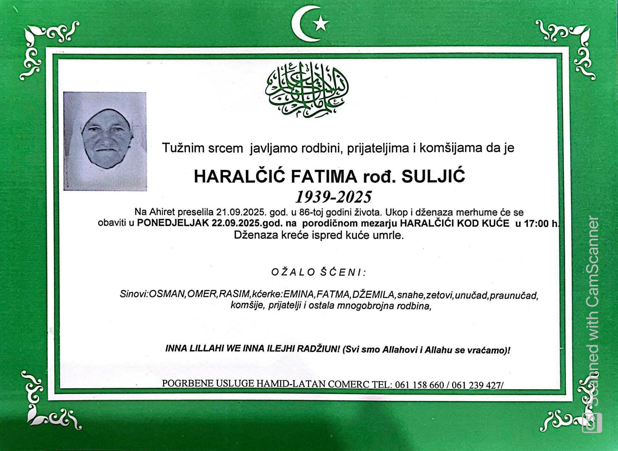 Tužnim srcem javljamo rodbini, prijateljima i komšijama da je HARALČIĆ FATIMA rođ. SULJIĆ na Ahiret preselila 21.09.2025. godine u 86-oj godini života.