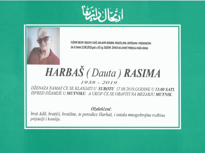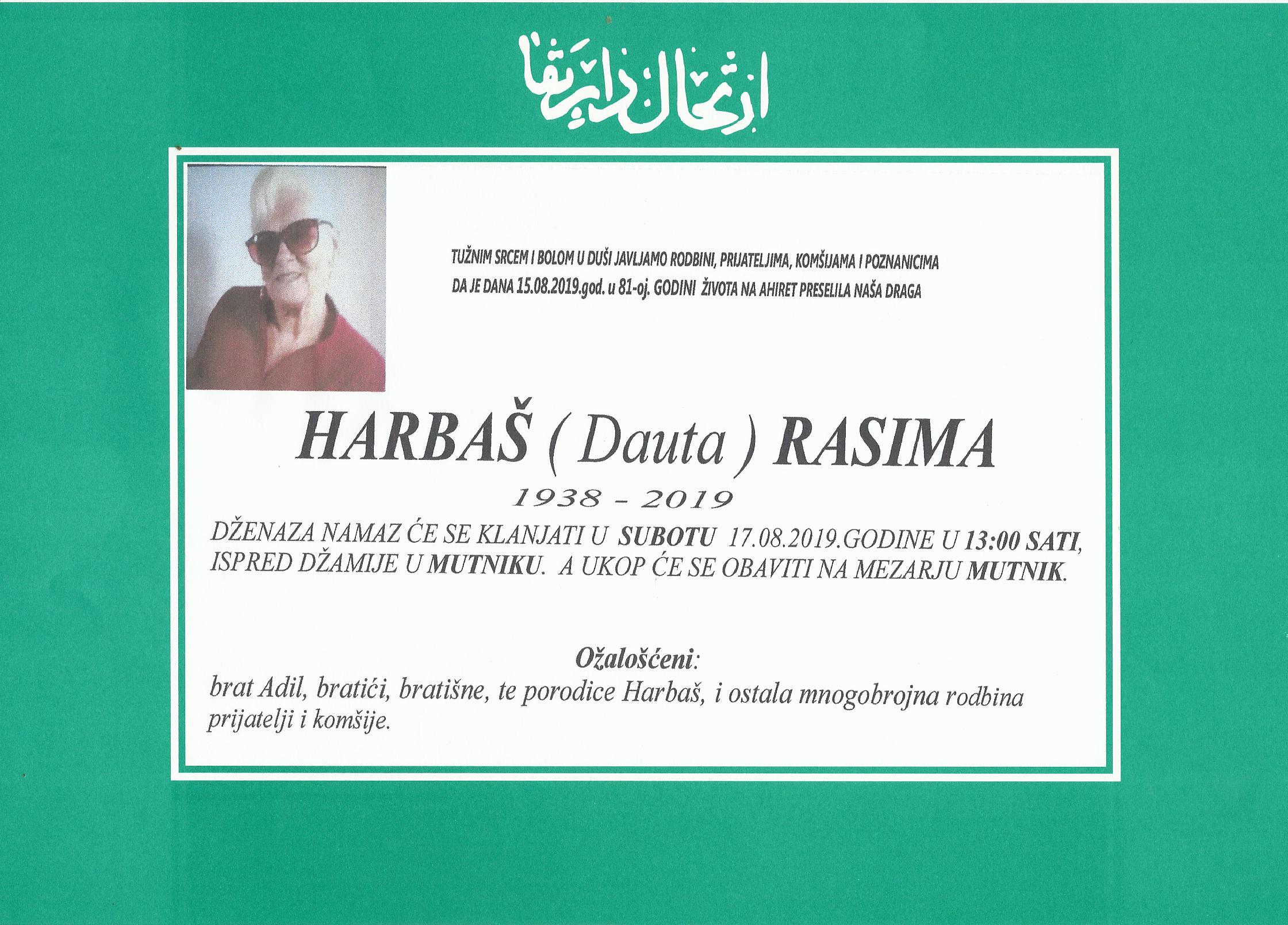 Sa žalošću javljamo rodbini, prijateljima i poznanicima da je dana 15.08.2019. god na Ahiret preselila u 81-oj godini života naša draga Harbaš (Dauta) Rasima
