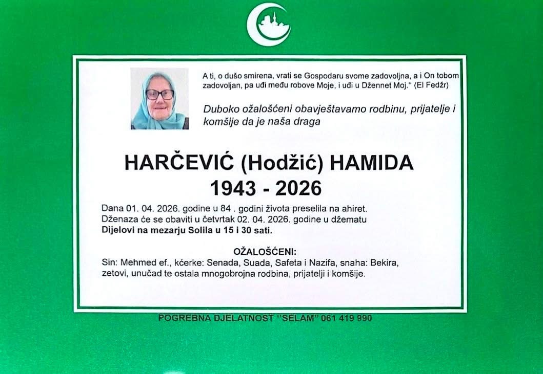 Dženaza će se obaviti u četvrtak, 02. 04. 2026. godine, u džematu Dijelovi, na mezarju Solila u 15:30 sati.