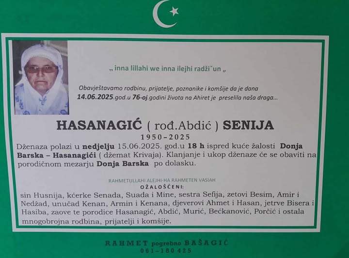 Tužnim srcem javljamo rodbini, prijateljima i poznanicima da je dana 14.06.2025. godine u 76. godini života, na ahiret preselila Hasanagić (rođ. Abdić) Senija.